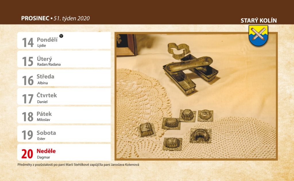 ve spolupráci s obecním úřadem vydáváme další stolní kalendář Starý Kolín 2020 s motem Jak se žilo za první republiky. To odkazuje na loňskou výstavu konanou v budově bývalého kina. Kalendář obsahuje předměty, které jste zapůjčili pro konání zmíněné výstavy.